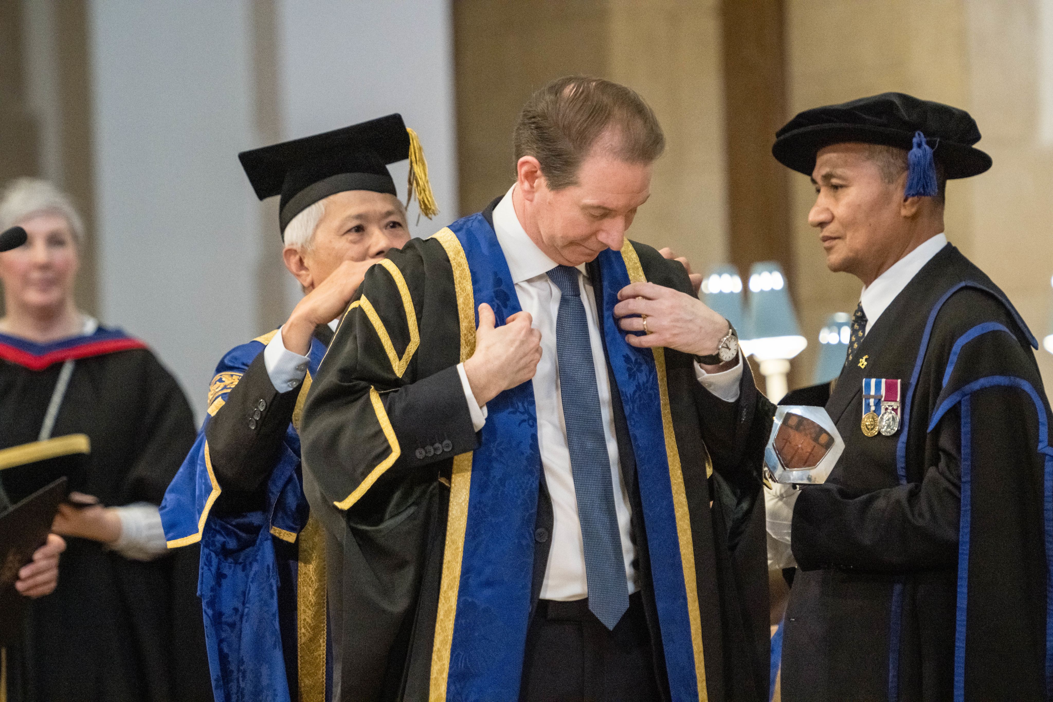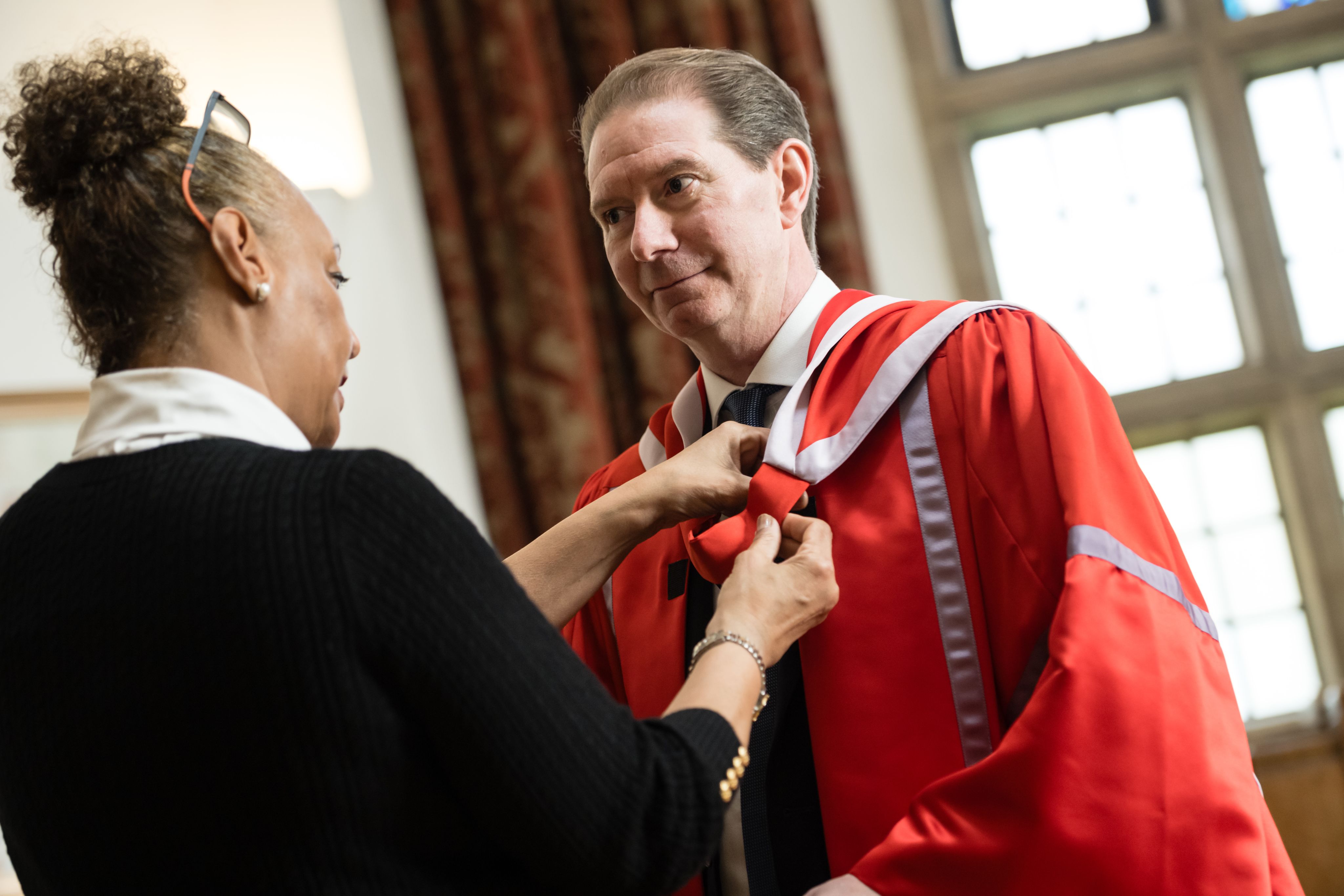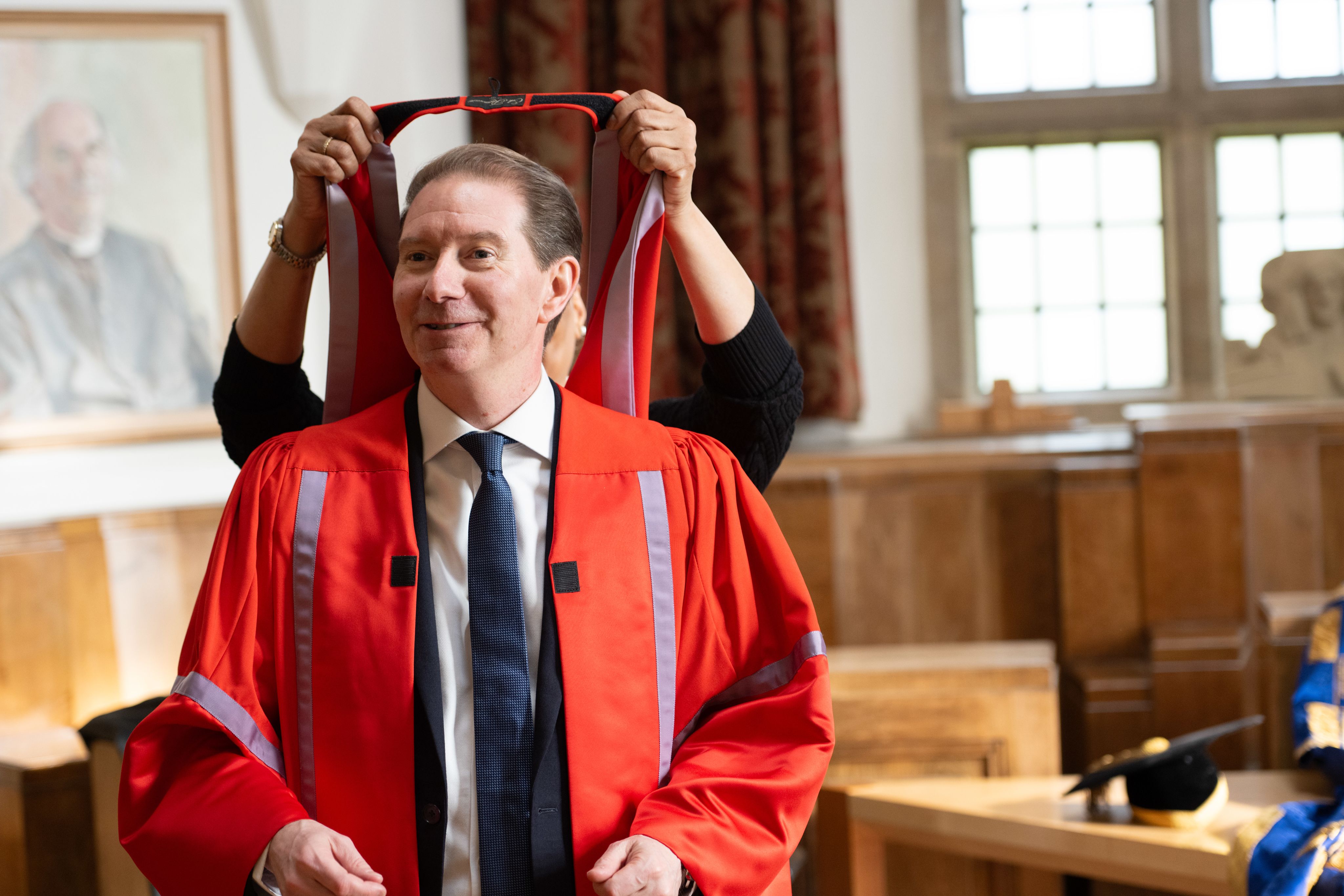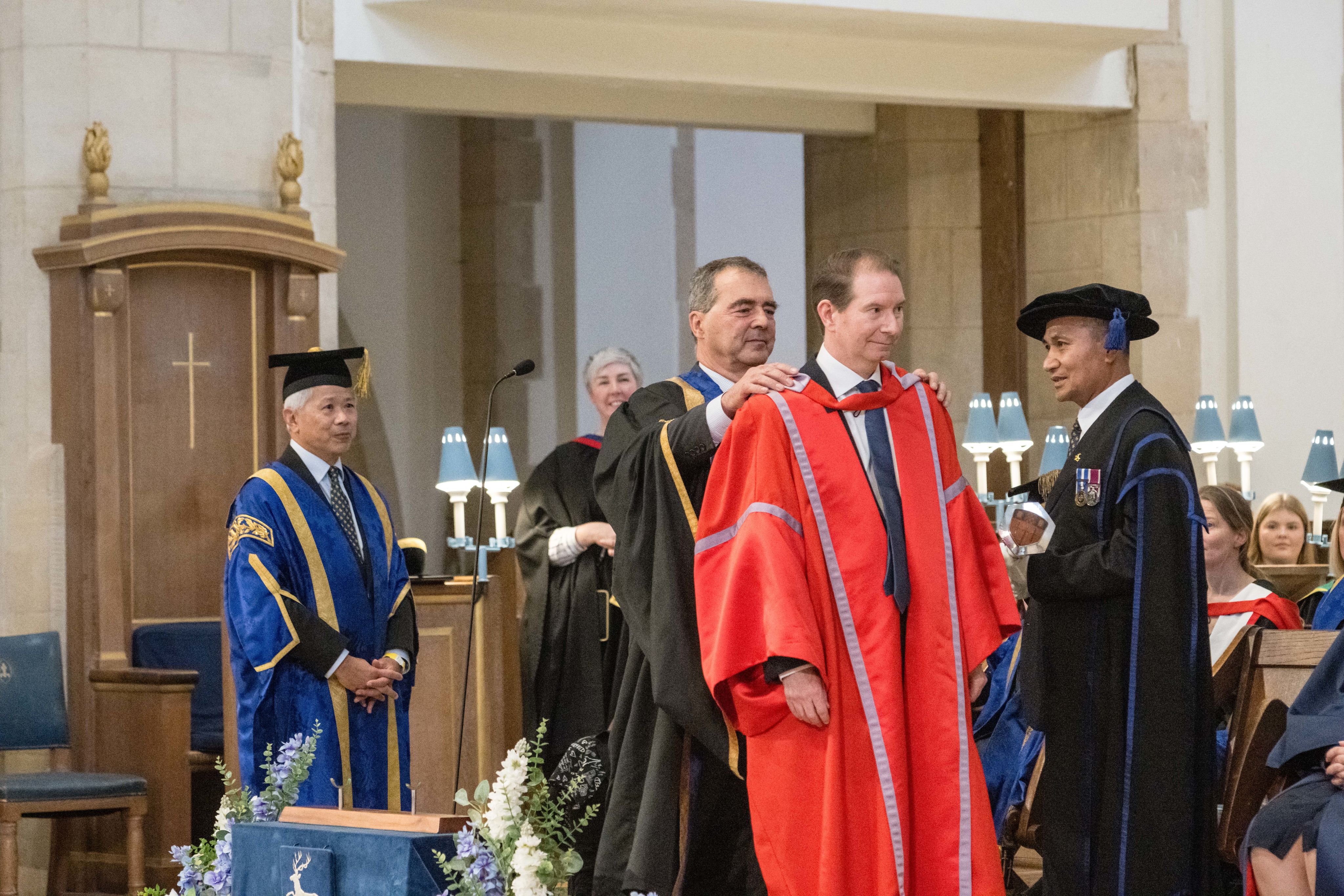 During the formal installation ceremony, Prof Jarvis is presented with a new robe and pledges to uphold the Ordinances of the University.