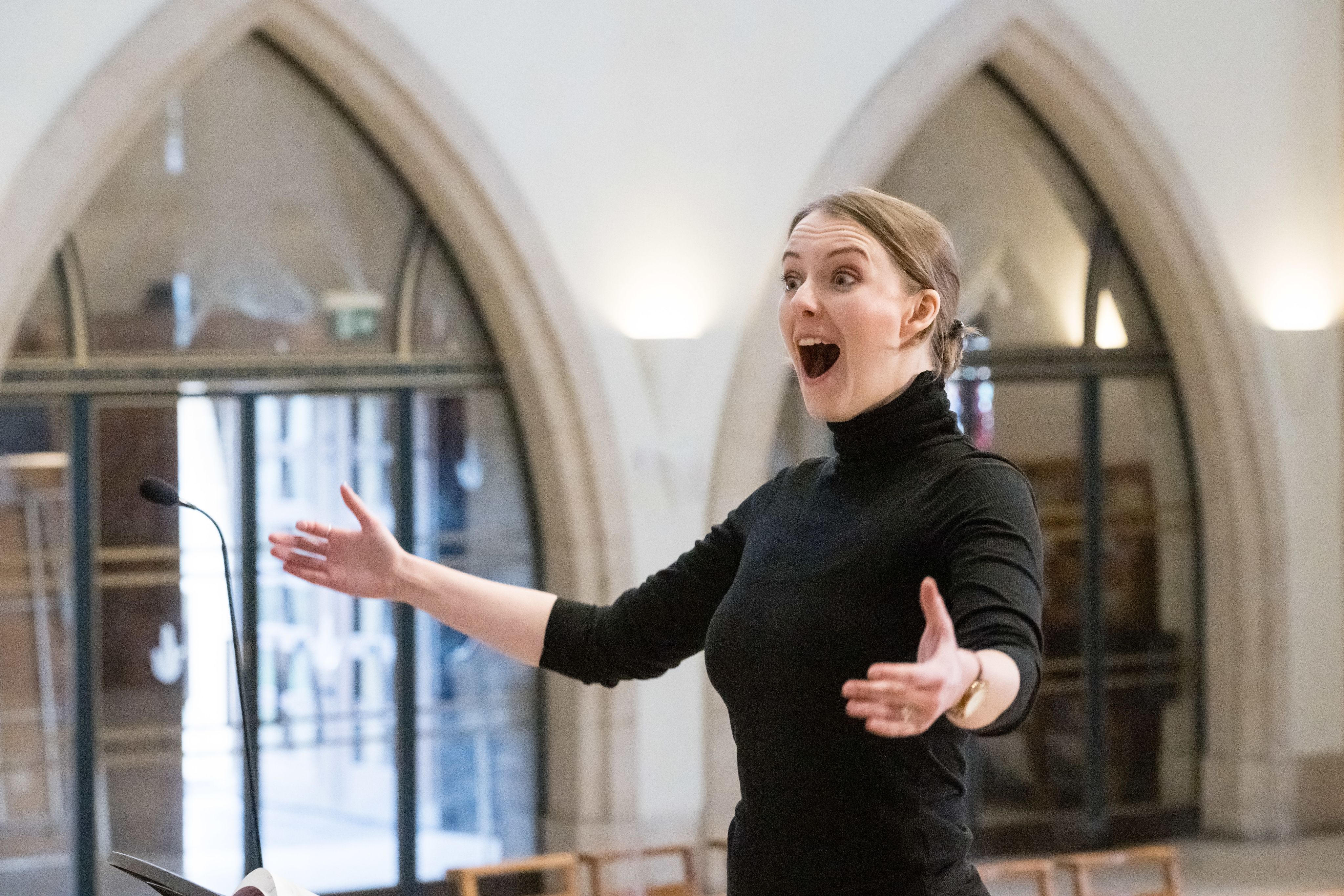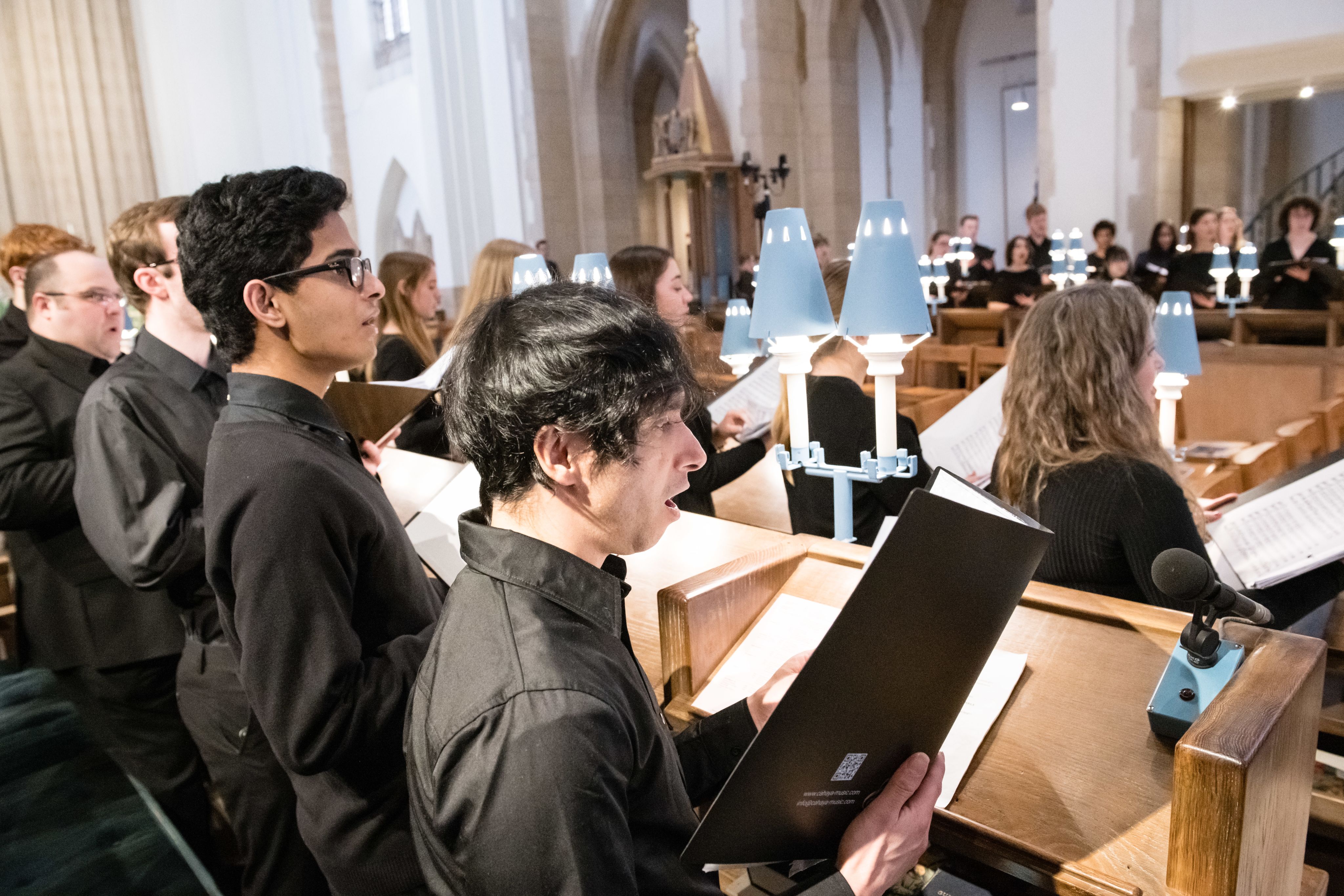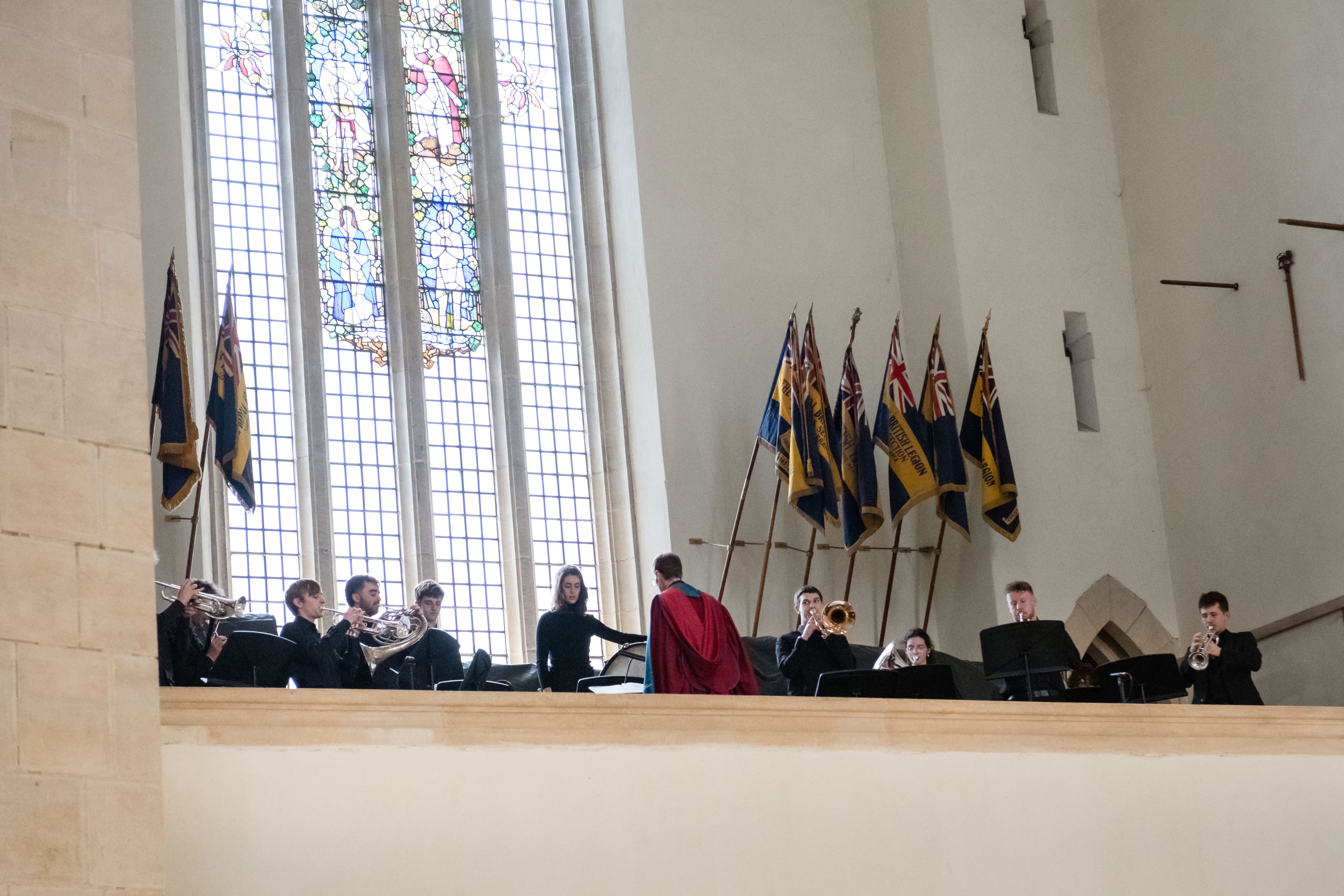 The Chamber Choir's director Amy Kearsley, a recent music graduate of the University and now professional singer, conducted the choir in the main choir stalls, accompanied by final-year BMus Music student William Brooke at the organ, plus the brass and percussion from their place in the gallery.