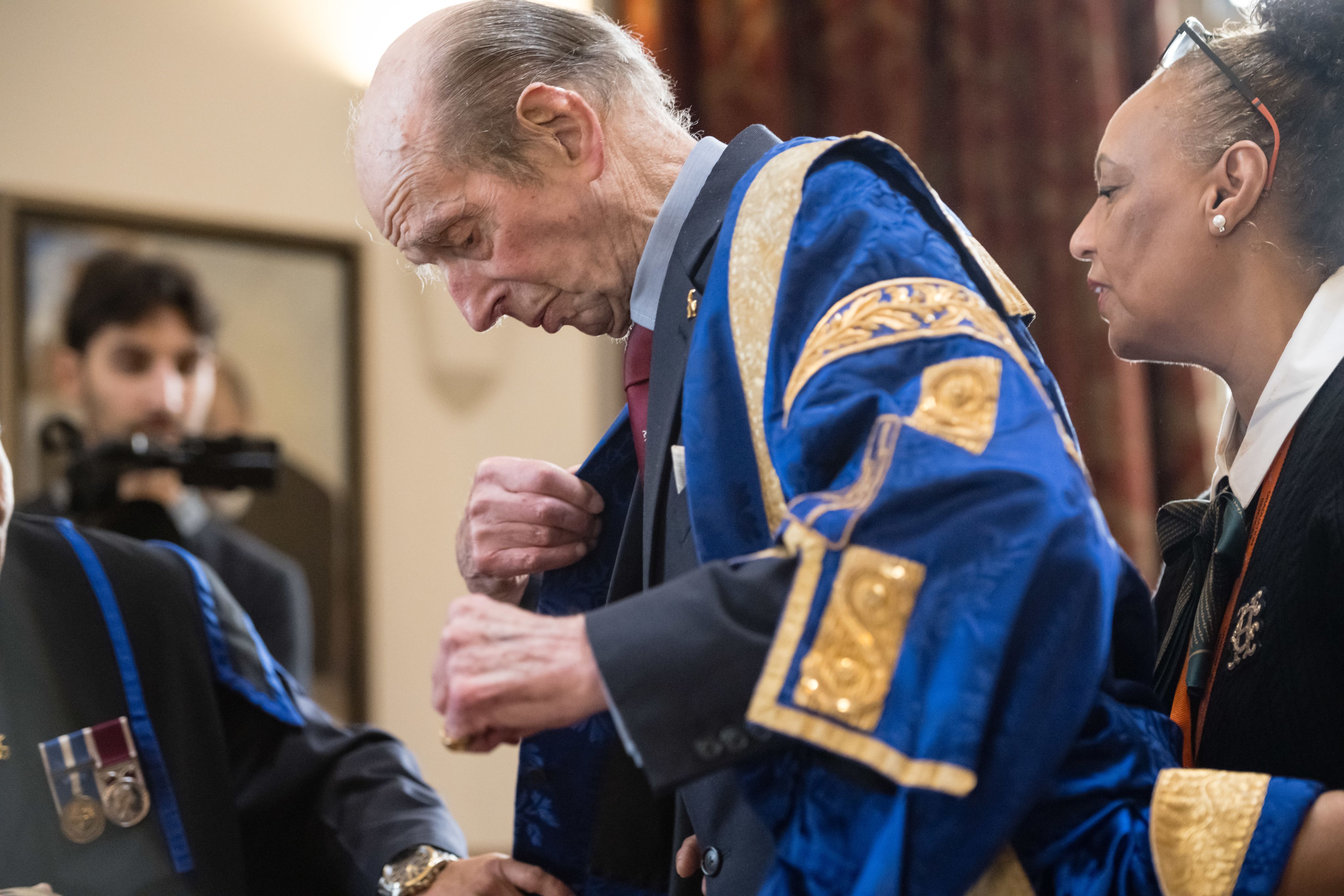 The University of Surrey’s Chancellor, HRH The Duke of Kent, puts on a robe of blue brocade edged with gold lace and additional ornamentation.
