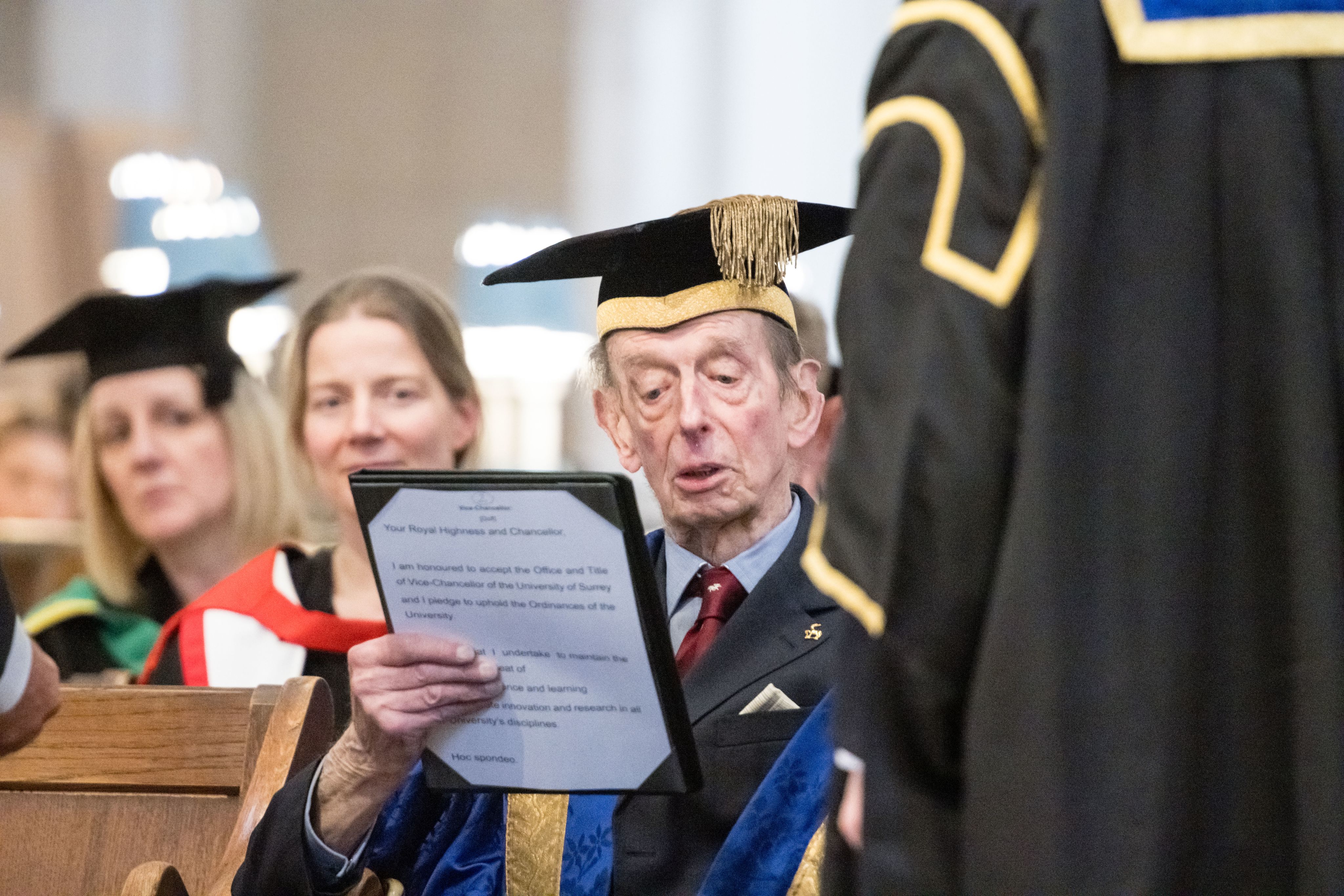 With his hand on the University mace, HRH The Duke of Kent confers the office and title of Vice-Chancellor of the University of Surrey upon Prof Jarvis.