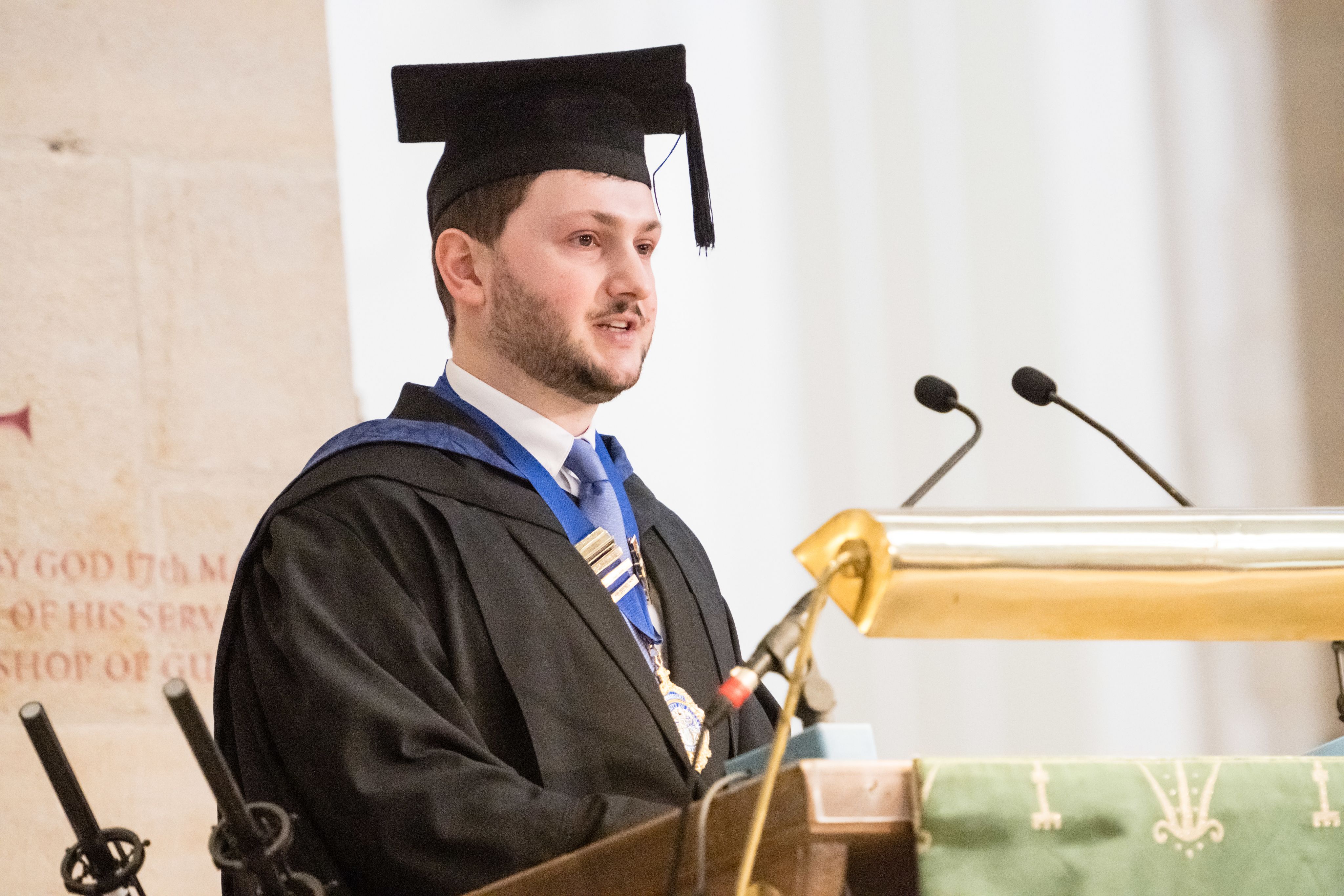 Matt Aikin, President of the Surrey Students’ Union 2025/26, offered a second ‘Welcome’ on behalf of the University community, in which he recognised the productive relationship nurtured between the University and its students.
