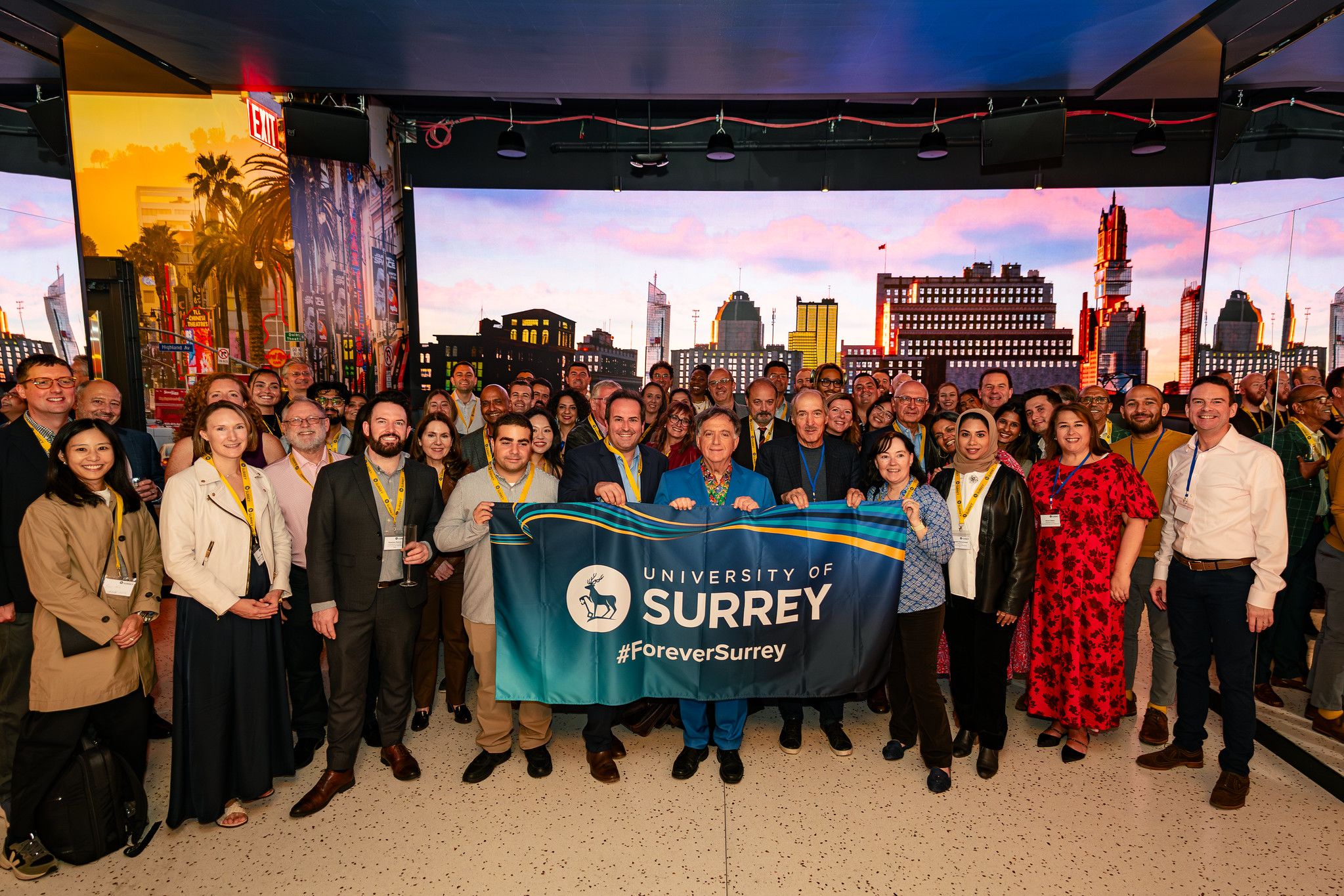 Pictured: Surrey alumnus and Planet Hollywood founder, Robert Earl holds a University of Surrey banner among Surrey alumni at a New York event.
