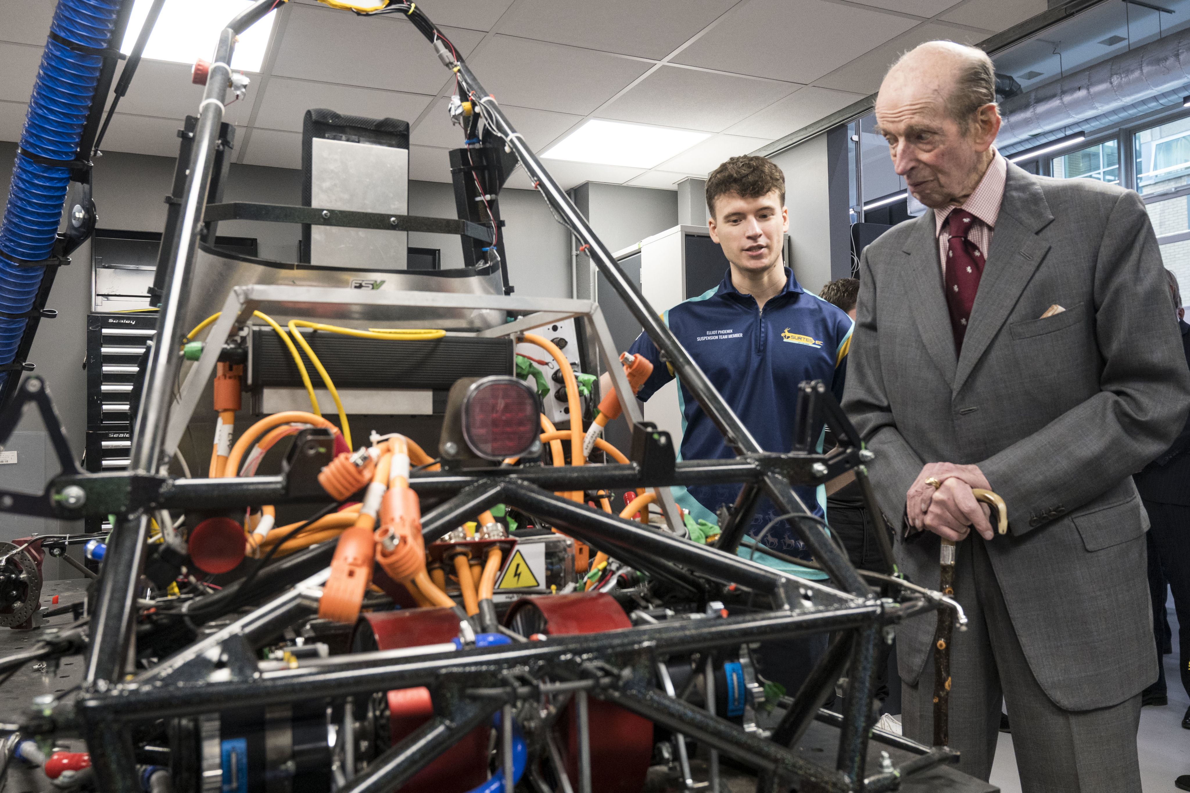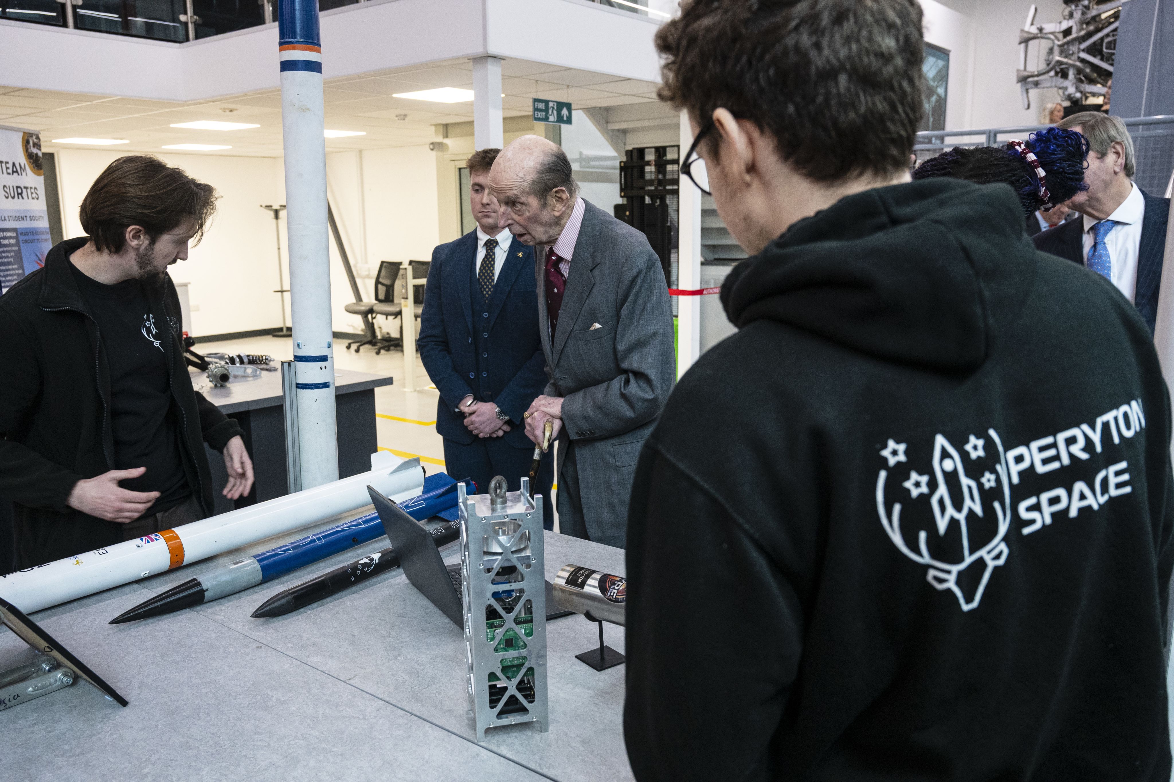 HRH The Duchess of Edinburgh was joined at the Surrey Space Centre by the University’s Chancellor, The Duke of Kent. During their labs visits they saw a student-designed satellite deploy pod which will push a payload from a rocket into space.