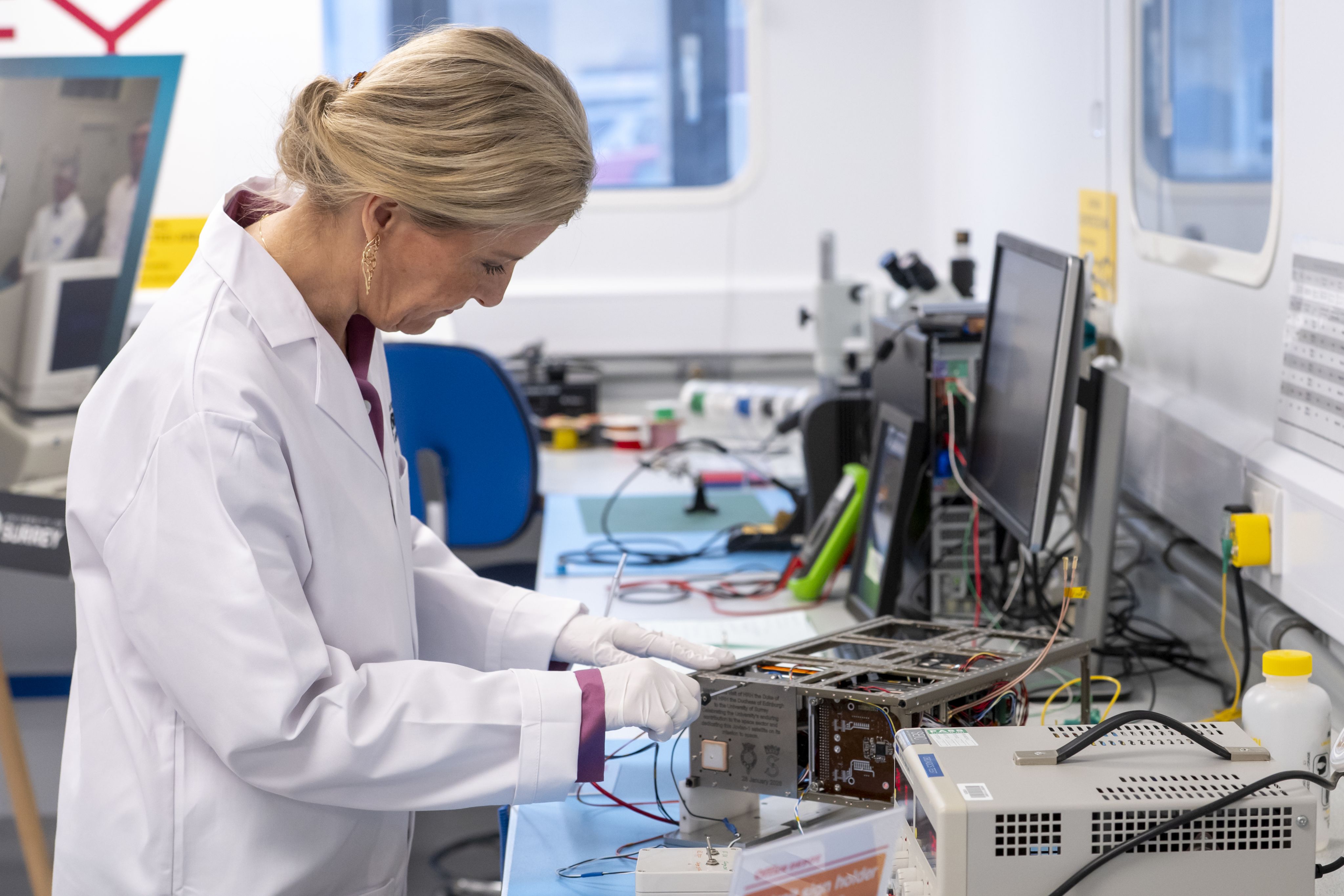 In the clean room, Her Royal Highness helped to fit a panel engraved with Their Royal Highnesses’ Royal Cyphers to Jovian-1, a satellite which Surrey students helped develop.