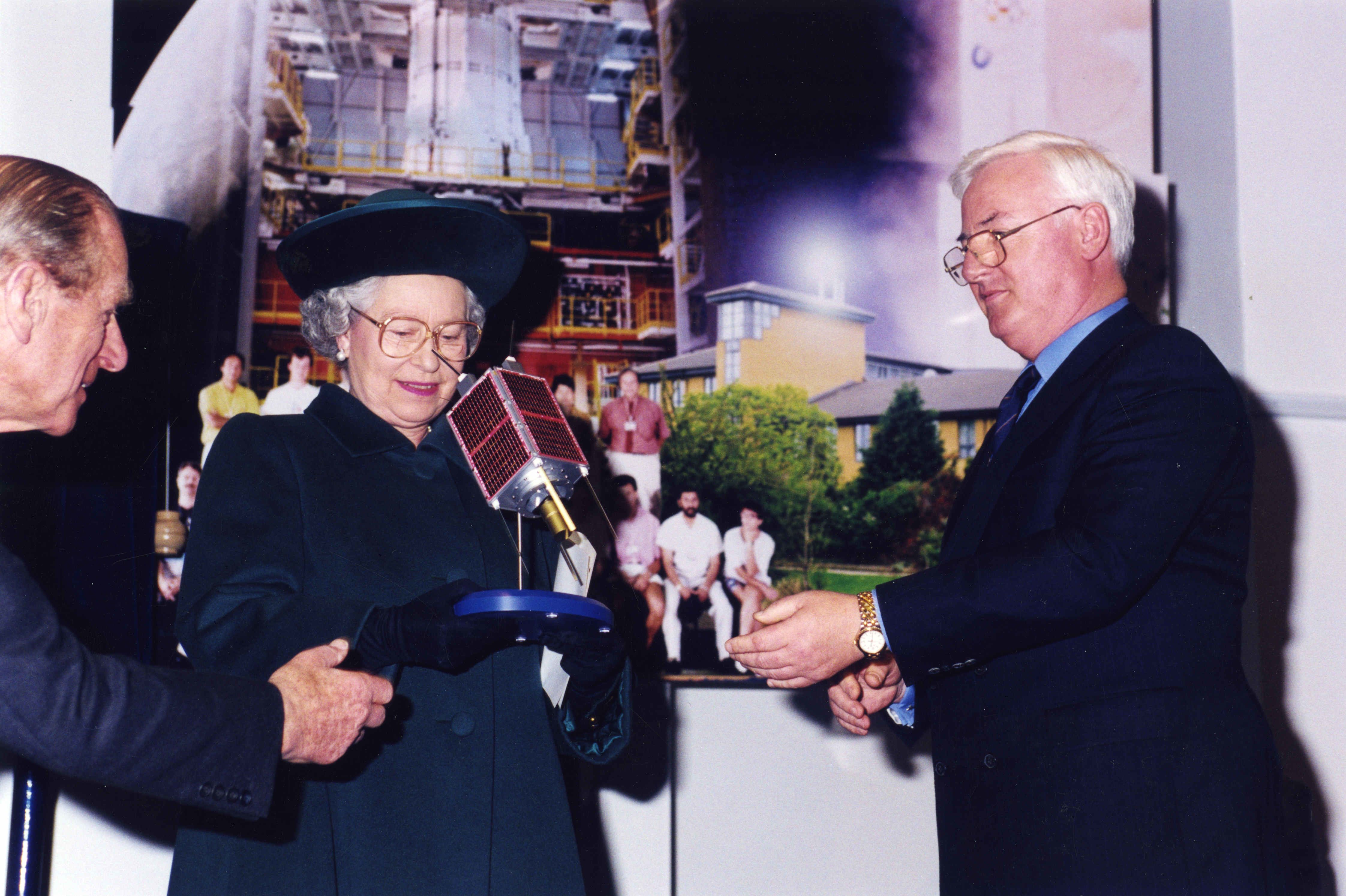 In 1998, she once again paid a visit to the Surrey Space Centre with His Royal Highness The Prince Philip, Duke of Edinburgh and His Royal Highness The Duke of Kent. (Ref no: Acc2016-13/10/P2668/18A © University of Surrey)
