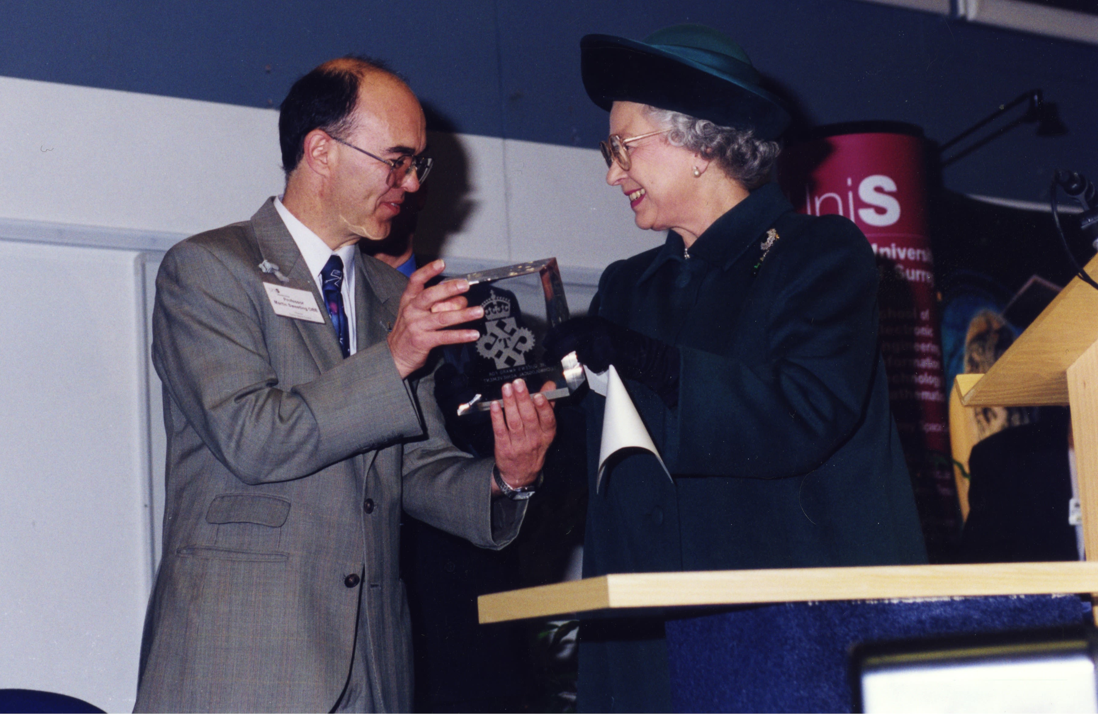 Queen Elizabeth II presents The Queen's Award for Technological Achievement to Professor Martin Sweeting for his pioneering work on small satellites (Ref no: Acc2016-13/11/P2656/32 © University of Surrey.)