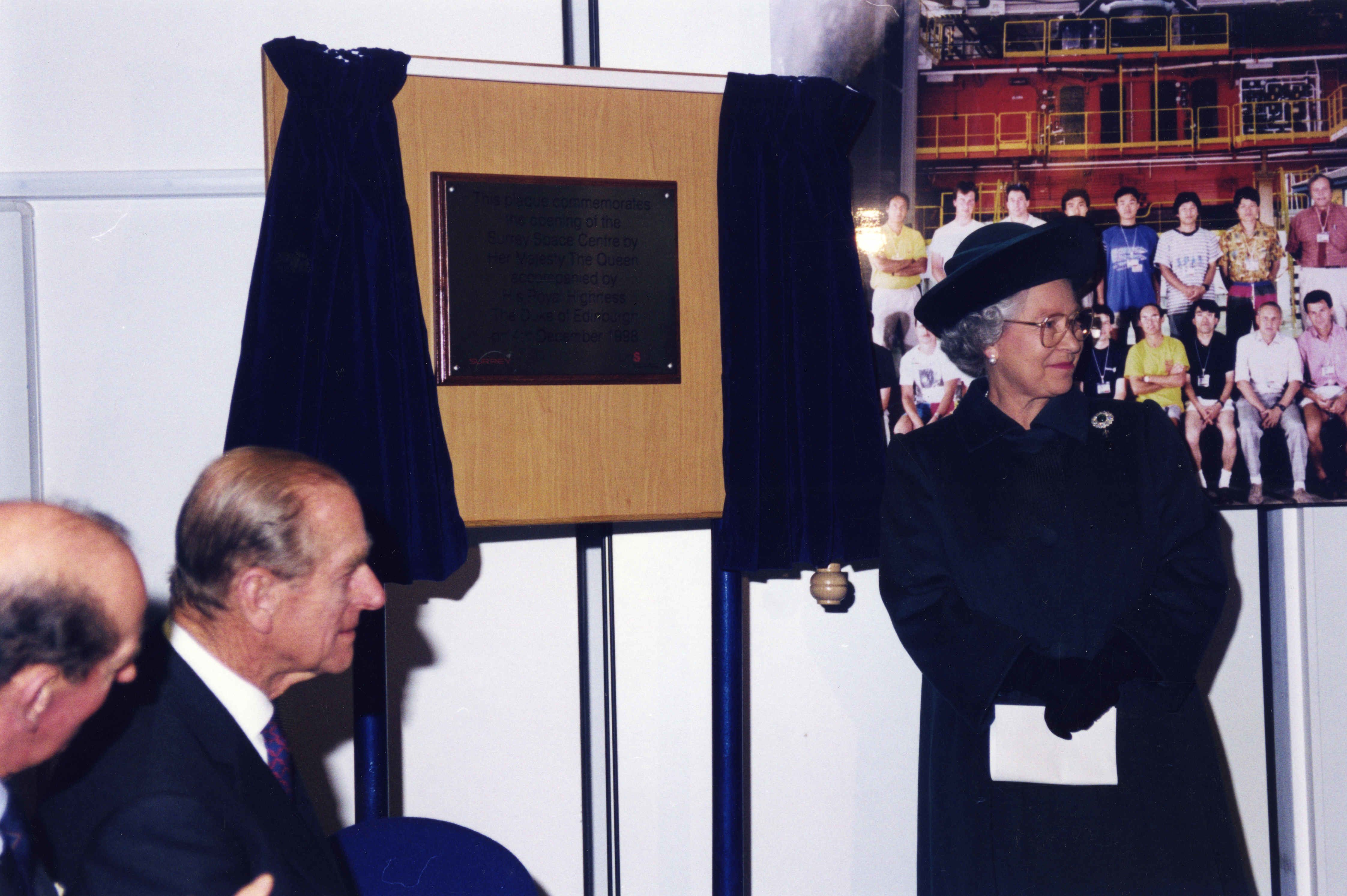 Queen Elizabeth II unveils a plaque to commemorate the opening of Surrey Space Centre on 4 December 1998, accompanied by His Royal Highness The Prince Philip, Duke of Edinburgh and His Royal Highness The Duke of Kent. (Ref no: Acc2016-13/11/P2658/15A - © University of Surrey.)